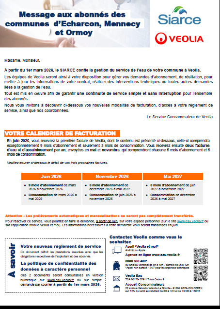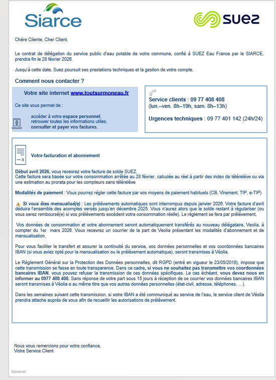 – Courrier d’information diffusé selon les canaux habituels de communication aux abonnés par l’ancien délégataire, Suez, précisant les modalités de facturation et de transmission des coordonnées. Par ailleurs, un courrier élaboré en commun par le SIARCE avec le nouveau délégataire Veolia (portant également le logo de la collectivité) a été envoyé aux abonnés du service, afin d’informer les usagers des modalités de reprise des contrats, de la continuité de la facturation et de la mise en place des dispositifs de mensualisation. Ces démarches correspondent aux pratiques habituelles lors d’un changement de délégataire et visent à garantir une continuité sans rupture pour les usagers.